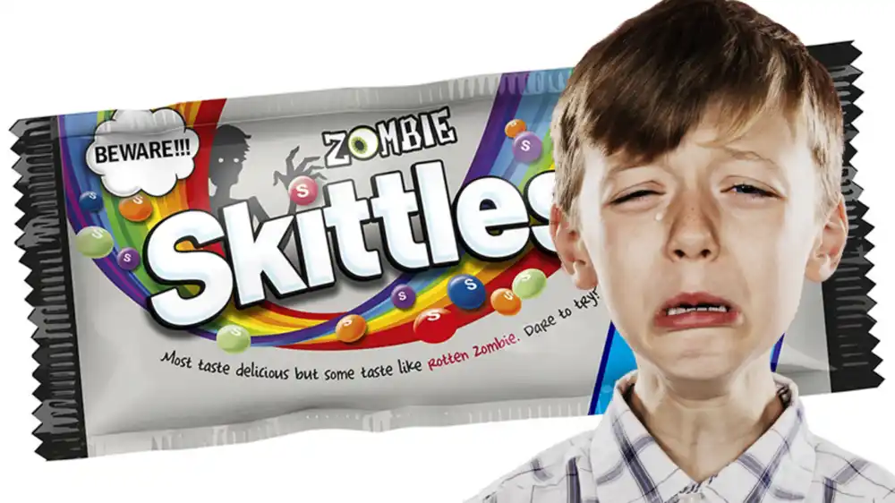 Skittles maker Mars Wrigley claims these Skittles have a “zombie” Skittle in addition to the standard fruit flavors and come in a gray package rather than a red one. The undead Skittle is disguised as a “rotten zombie”