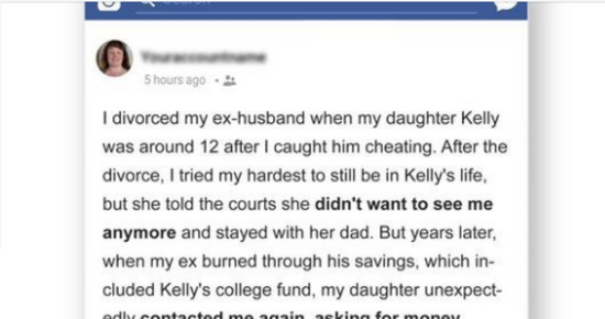 The woman’s decision to divorce led to estrangement from the daughter, who was influenced by her father, grandparents, and in-laws to view her mother as a villain. Despite years of trying to reconnect, her daughter’s sudden desire to reconnect only arose when she needed financial aid for her college education.