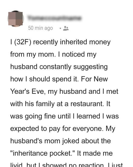 I (32F) as of late acquired cash from my mother. I saw my better half continually proposing how I ought to spend it, frequently alluding to rich buys or ventures that appeared to be more for his advantage than o