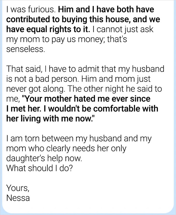 Nonetheless, her significant other has forced an awkward condition. Nessa winds up torn in this tough spot and has connected with us for guidance.
