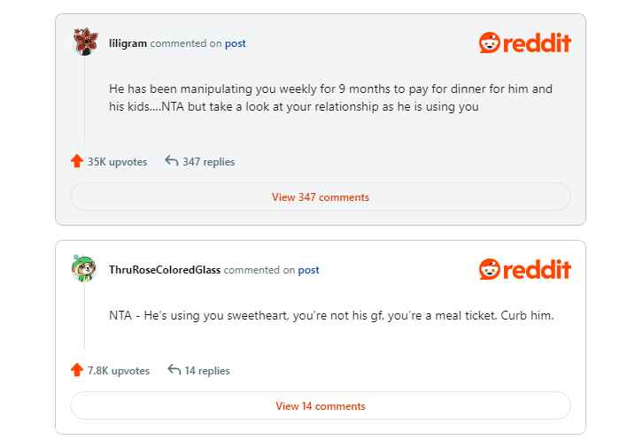 “My boyfriend, m36, and I, f32, have been dating for nine months. His two young daughters really enjoy dining out. Every time we go out together, he always forgets to take his credit card to make the payment. I have to pay because the kids would travel with us. But to be honest, it broke me this month and last.