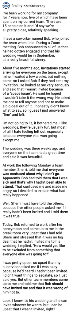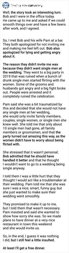 Bob can give a reasonable explanation for not inviting his colleague, but by claiming that he didn’t think he would want to attend the wedding as the only single man, he excuses his actions by suggesting that the narrator was overreacting to the situation.