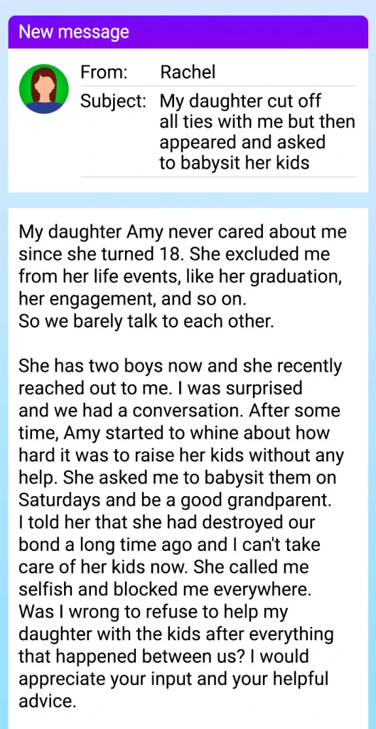 But below the surface, suspicions were beginning to grow. Why, after all the conflict and unresolved stress, was your daughter suddenly trying to help? Could there be ulterior motives or unspoken expectations behind his request? A history of disagreements and emotional trauma overshadows what should have been a straightforward decision, leaving you questioning whether this request for help was truly sincere or obscured deeper issues