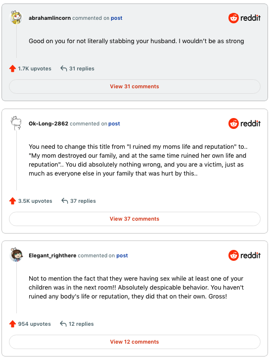 “My mother and my husband were having s*x when I walked into my bedroom. It freaked me out even more when my mother yelled at me to get out of ‘their’ bedroom.”