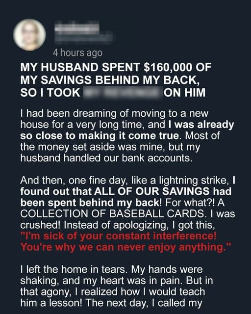 After finding out this information, I methodically prepared my retaliation. I gathered all the supporting information, carefully recorded each transaction, and created an extensive report. Then I filed for divorce. However, I didn’t stop there.