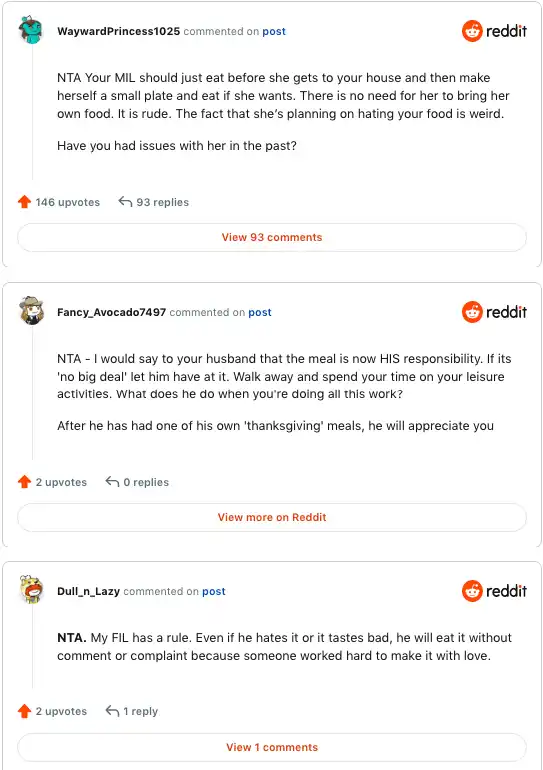 However, the joyful anticipation was disrupted by an unexpected revelation on the eve of the Thanksgiving celebration. Her husband’s insight that his mother intended to bring her own food struck a discordant chord, leaving the Redditor confused and disheartened. The joyous anticipation of sharing her carefully prepared feast with her family was clouded by confusion and a sense of rejection, causing her emotions of hurt and frustration. A female Redditor who wishes to remain anonymous shared her experience on the “AITA” forum on November 23, 2022. The 32-year-old woman was planning to have Thanksgiving dinner at her home that year.