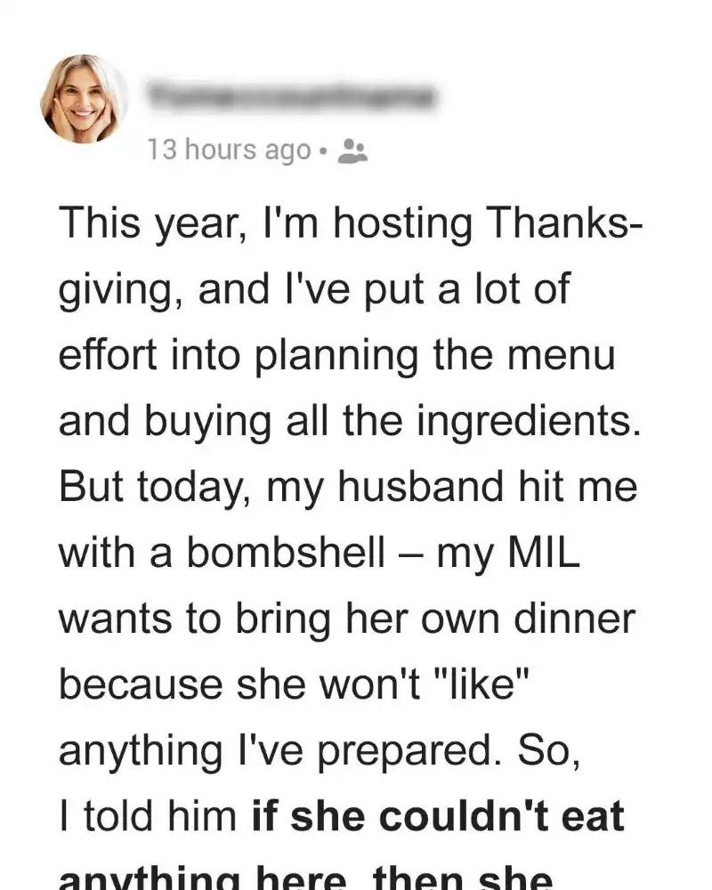 A Thanksgiving saga shared by an anonymous Redditor revealed a difficult situation full of family tension and conflicting expectations. Despite the woman’s careful preparations and heartfelt intention to create an unforgettable feast for her loved ones, the unexpected twist of her mother-in-law’s decision to bring her own dinner disrupted the harmony of the occasion.