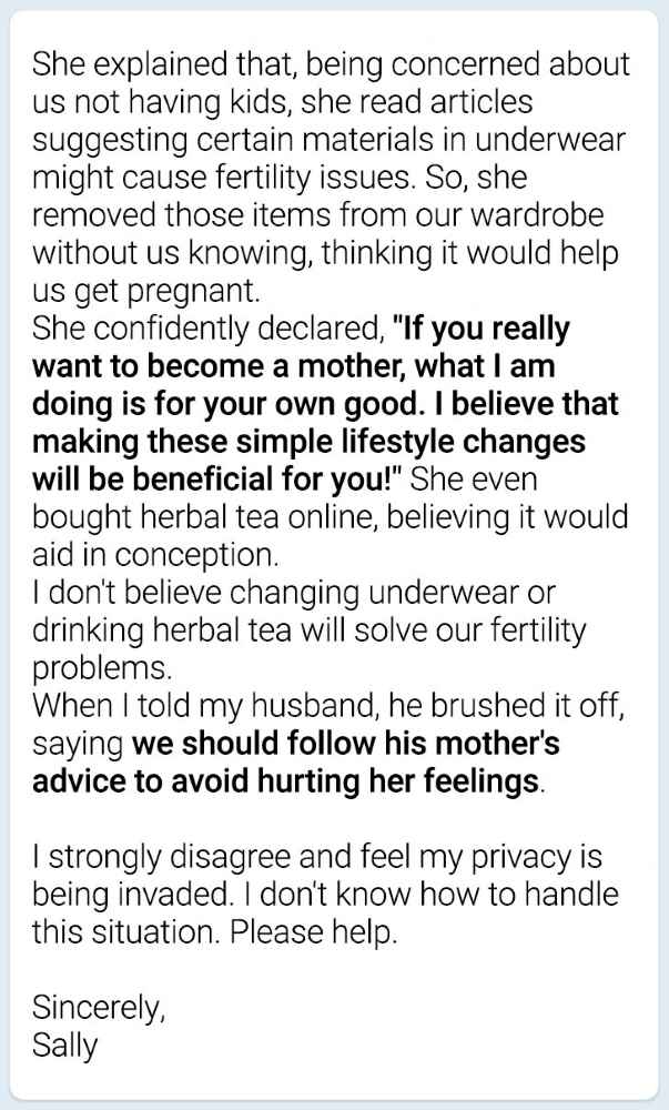 We are ready to provide our readers with some advice that might be useful. First and foremost, the key is to engage the husband in an honest discussion with the mother-in-law. Consider in advance what help your mother-in-law can provide. For example, invite her to attend your fertility events or ask her to help you in the kitchen. She won’t break any lines and still feels biased in this way.