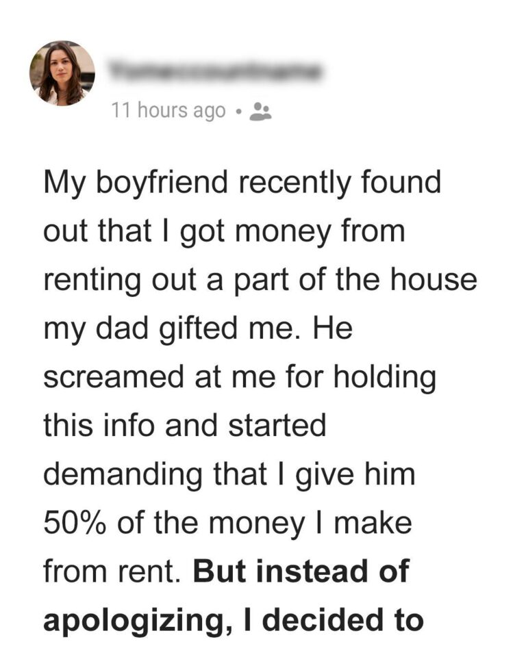 “He insisted that I give him half of my rental income or I was as bad off as he believed,” the woman noted. After her boyfriend gave her the silent treatment, the woman was able to collect her thoughts for a moment.