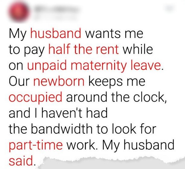 At the point when I got some information about covering each of our consumptions during my neglected maternity leave, he was absolutely against it. He expressed, “We vowed to part everything uniformly, and I’m actually working.