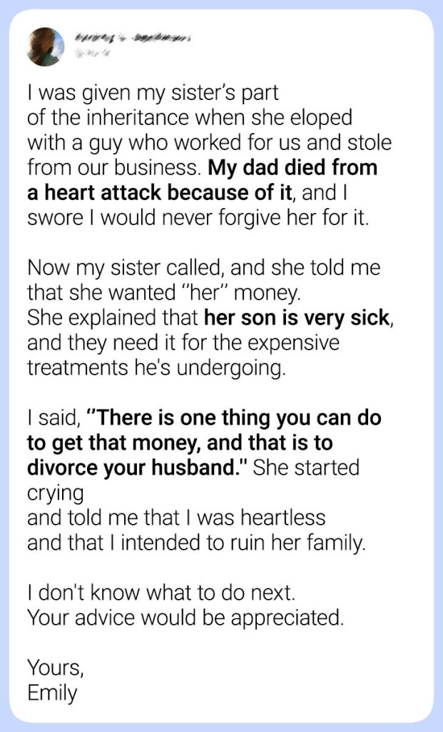 After being left out of the inheritance, her sister, who she claims caused strife in their family, has returned to claim her share. Emily is torn about what to do and feels conflicted. She contacted us asking for advice.