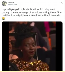 A fan shared the video along with the caption: “Lupita Nyongo is slowly realizing it’s not a bit and Will is pissed #Oscars2022.”