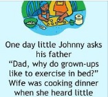 One day little Johnny asks his dad “Father, for what reason do adults like to practice in bed?” Spouse was preparing supper when she heard little Johnny ask, so she snoops and pays attention to what her better half should say.