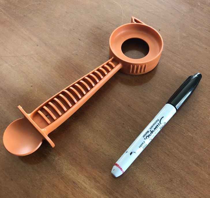 5. “This was in the kitchen bag my family sent to my apartment. It’s made of plastic and has a little scoop on the bottom. Use a Sharpie for the scale.”