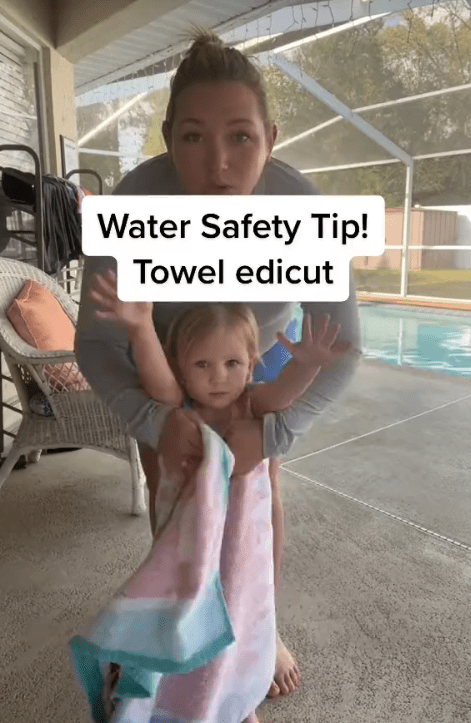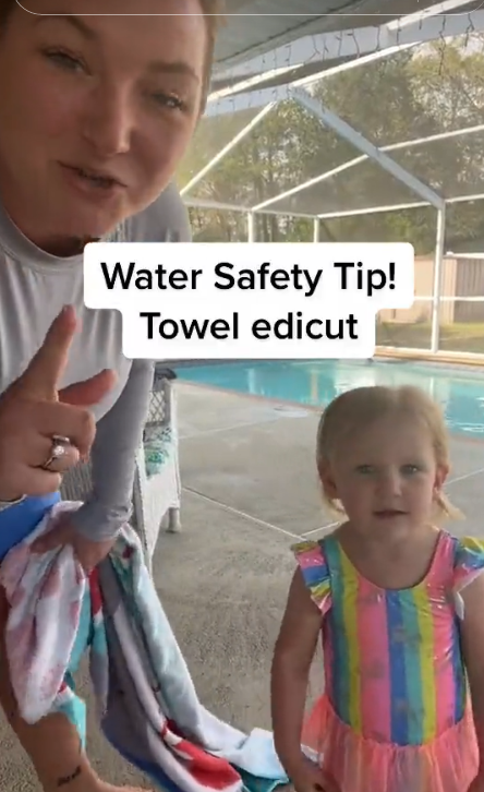 In a TikTok video, Nikki shows how parents should properly towel their children, not how they do it naturally. According to Nikki’s pool safety tips, putting a towel around your child’s shoulders puts them at risk of drowning. Her own child appears at the beginning of the video.
