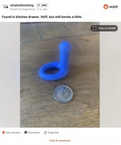A yellow, phallic rubber object of modest size was discovered by the user next to his kitchen sink. Feeling confused and a little uneasy, they searched Reddit for a solution. The original poster was relieved when the community immediately recognized it as a keychain for specific measuring cups or cups.