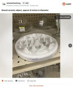 A Reddit member discovered a ceramic or porcelain object with protruding shapes on a flat plate while browsing the aisles of a thrift store. The image was shared and the community quickly realized that it was a dog bowl made for dogs who like to eat fast. Its usefulness has been debated, with some emphasizing how it can help prevent mold and bacteria.
