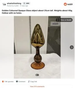 One Reddit member was intrigued by an opaque glass object with a gold tint that was 25 cm long and weighed 40 grams. The community quickly recognized it as a blown glass home decoration that looked like a work of art.
