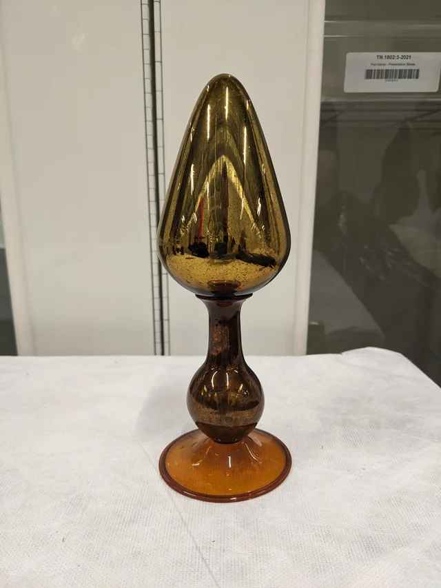 Someone discovered an opaque glass object with a golden hue and questioned its purpose. The subject measured 25 centimeters in height and 40 grams in weight, according to the person who took the measurements.