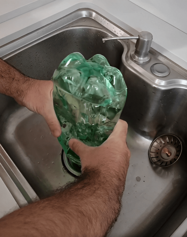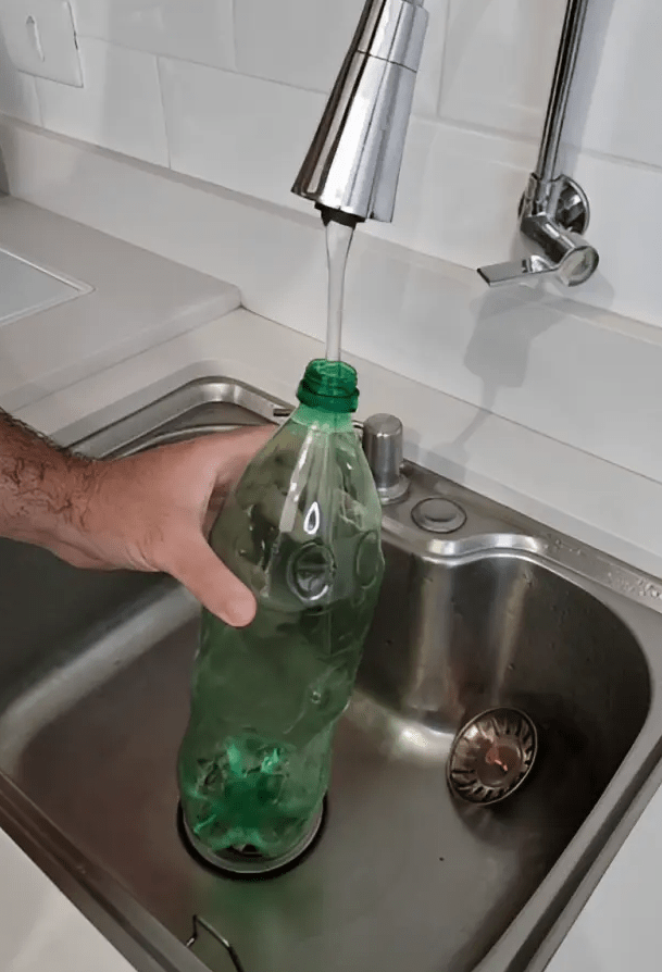 After applying strong pressure a few times, pull the water bottle out of the drain. Activate the faucet and let the water flow.