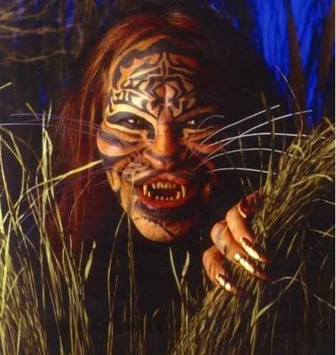 Stalking Cat donned yellow contact lenses with a cat’s eye emblem and had tattoos all over his face and torso. Interestingly, he even pierced his upper lip to create a mustache and kept it there. Avner’s commitment to metamorphosis was demonstrated by the careful and complex changes he made to his appearance to better reflect his totemic identity.