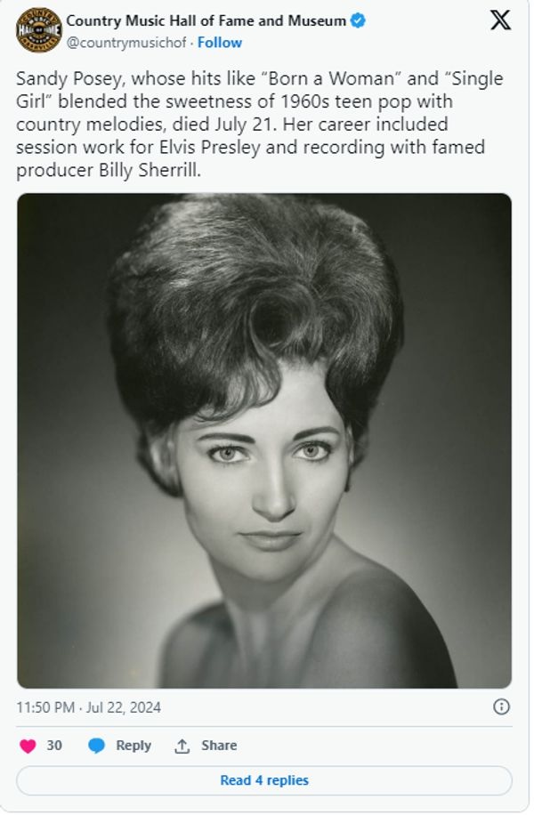 We are profoundly disheartened to educate you about the passing regarding Sandy Posey, a dearest vocalist from the 1960s.
