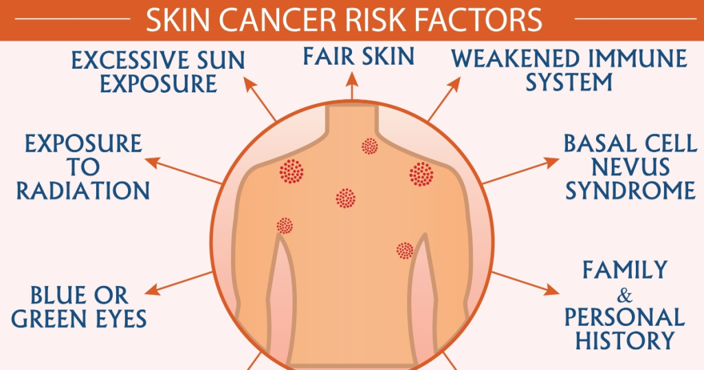 Although melanoma can occur anywhere on the body, it often appears on areas of the skin that have been exposed to sunlight. In addition, having multiple birthmarks, having a compromised immune system, and having a family history of melanoma can all increase the risk of the disease. (2)