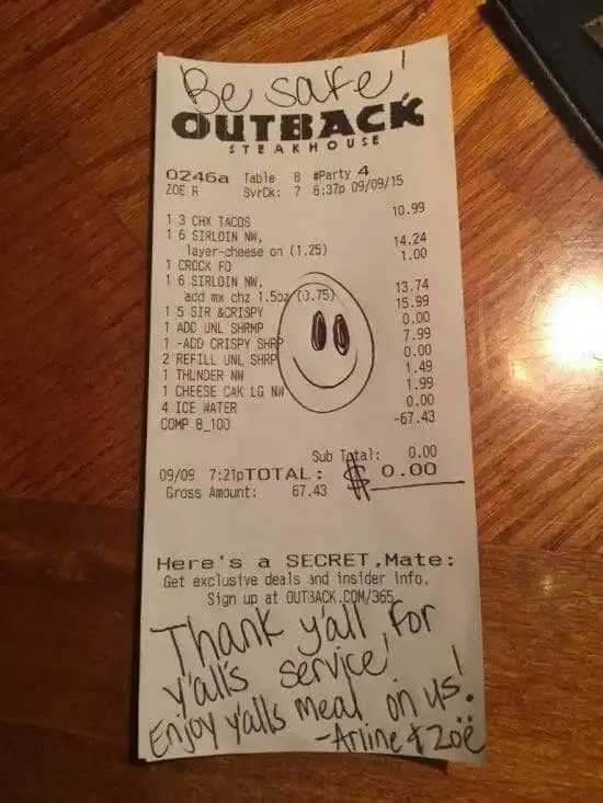 Afterward, the Slidell Police Department decided to recognize the two Outback Steakhouse employees, so they posted a photo of the receipt on Facebook.