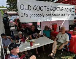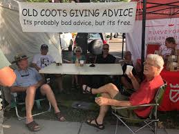 He came up with the idea for the club to set up a booth and provide counseling to individuals. The other guys were excited about it. So the following week they put up a stand with a big banner above it saying “It’s probably bad advice, but it’s free” and “Old coots give bad advice”.