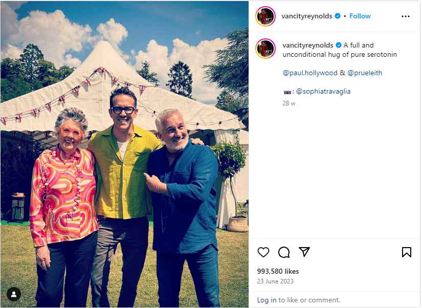 Reynolds captioned his photo “Full and unconditional embrace of pure serotonin” and included Prue and Paul as hosts.