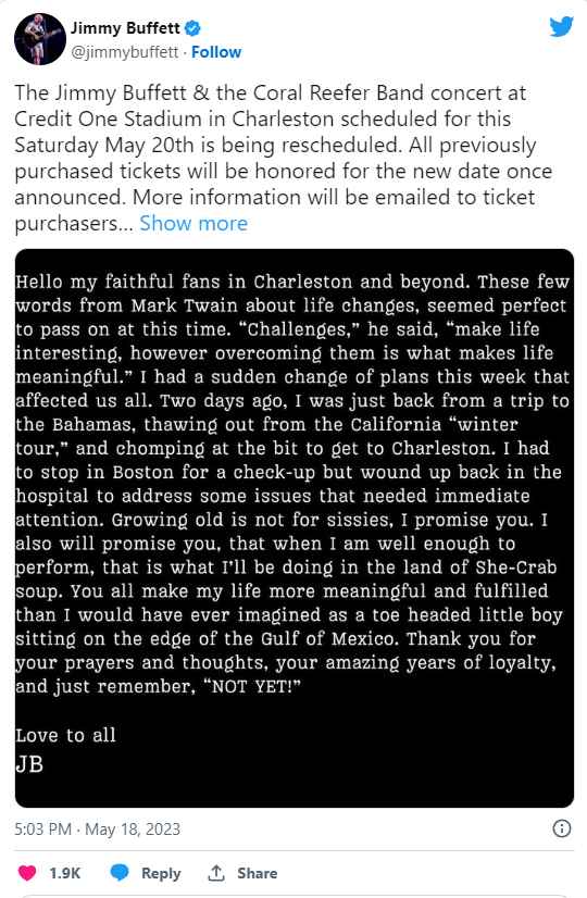 Buffet announced to his fans on Twitter just two days before the show that the show would not go ahead as planned. He explained how, during a routine visit to Boston, he was suddenly admitted to the hospital to deal with major health issues.