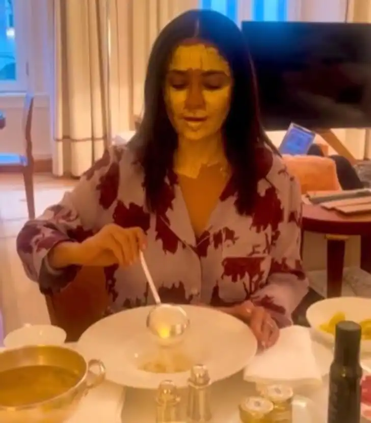 She recently posted a video of herself eating chicken soup while wearing a golden beauty mask.