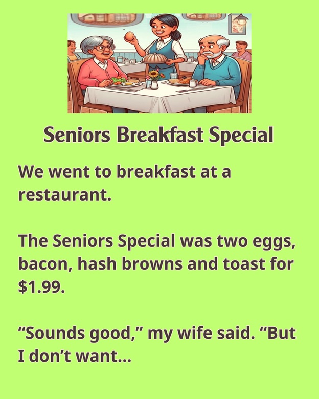The Seniors Unique was two eggs, bacon, hash earthy colors and toast for $1.99. “Sounds great,” my significant other said. “In any case, I don’t need the eggs.” “Then I’ll have