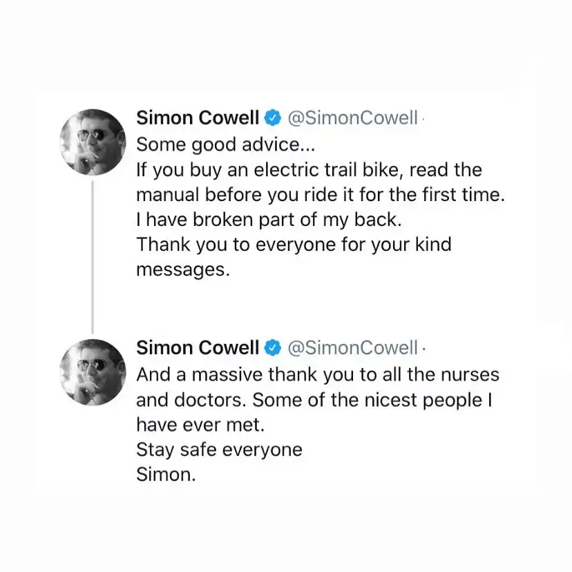 “Here’s some sage advice: read the manual before you pull out your electric trail bike for the first time,” Cowell wrote on Twitter, thanking his followers and friends for their “kind words.”