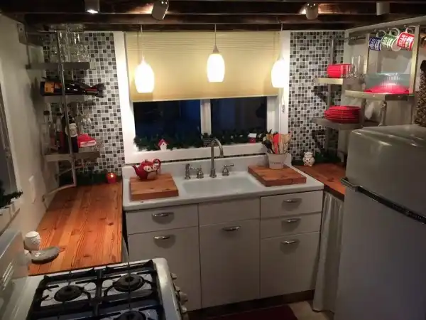 Michelle spent fifteen months building the house, which measures eight and a half feet wide by twenty-four feet long. It has all the amenities of a large modern house. What is the difference? Michelle doesn’t have a mortgage or much extra room to clean! Modern yet stylish with upcycled antiques from the 1940s and 1950s, the tiny house is located on an old Christmas tree farm in Sherwood, Oregon.