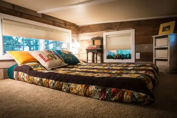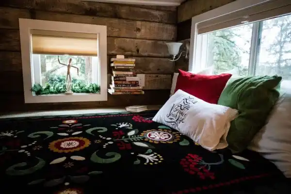 The tiny house upstairs is called My Tiny Hideout and is available for vacation rentals. It is earthy and modern. All you can see when you’re lying on the loft bed upstairs is the peaceful forest. Michelle spent two years collecting items in this beautiful house, making it even more special and unique.