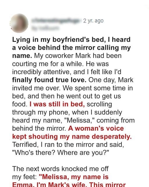 She had been hitched to Stamp for a considerable length of time, yet things had taken a dull turn. He became controlling and harmful, secluding her from loved ones. At the point when she attempted to leave, he secured her in that little room behind the mirror, involving it as his contorted type of control.