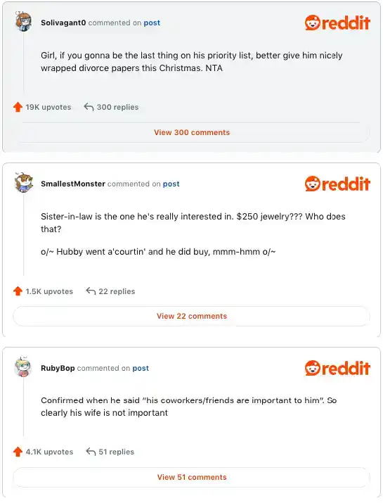 Desperate for direction, the wife took to Reddit to ask strangers for their thoughts and ideas. Everyone seemed to agree that her husband valued his friends and family more than he valued her.