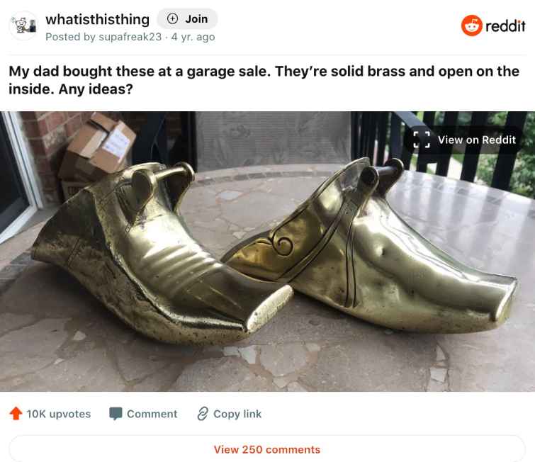 A member of the online community was curious about something he found at a garage sale: solid brass objects with a hollow interior. As far as the internet community was concerned, they were Mexican stirrups, or “tapaderos” to be exact. These stirrups have both practical and cultural value. They are commonly worn by cowboys in the southern United States as protective leg coverings. Virtual Conversation is a prime example of how community knowledge sharing can be used to solve puzzles around fascinating objects.