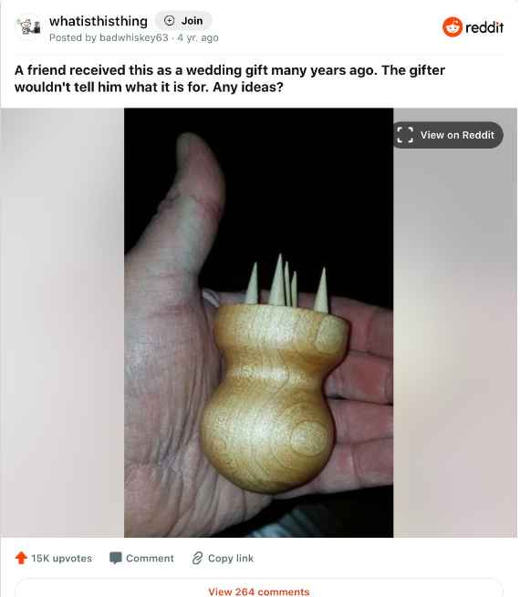 A mysterious wooden button with spikes was revealed by a Reddit user. The button was a wedding gift from a friend who kept its intended use a secret. The object was quickly deconstructed by the online community to reveal that it was a cheese slicer holder. The cheese does not need to be handled directly, as the spikes anchor it. The functionality of the gift was clarified, but it was not clear why the donor presented it in such a hidden way. This episode is a great example of online communities working together to solve puzzles and interpret mysterious objects.