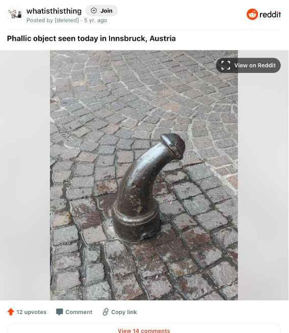 A traveler in Innsbruck, Austria searched the internet for an explanation after seeing a mysterious phallic symbol on the road. The internet community quickly recognized the object as a bollard, a typical directional sign found throughout Austria.