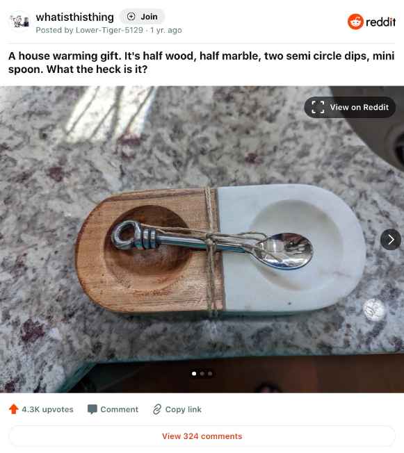 A mysterious housewarming gift left the recipient confused. It was a unique object, half wooden, half marble, with two small sinkers and a small silver spoon. This interesting piece was quickly recognized by the online community as a salt and pepper dipping container. The purpose of the shallow dives became apparent despite their unusual design, demonstrating the utility of internet platforms in deciphering the mysteries surrounding the special gifts.