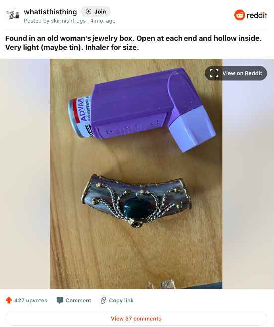 An elderly woman’s jewelry box contained a hollow tin tube with an open end, discovered by a Reddit user. It was decorated with an obscure front design. The mysterious object was quickly deciphered by the internet community as a scarf holder, a useful device that allows users to fasten a scarf around their neck without using conventional tying techniques. This finding highlights the utility of online resources for delving into the mysteries of unusual objects using the combined knowledge of the community.