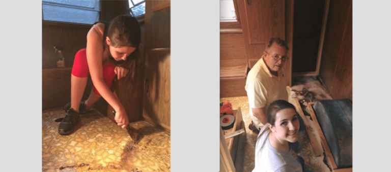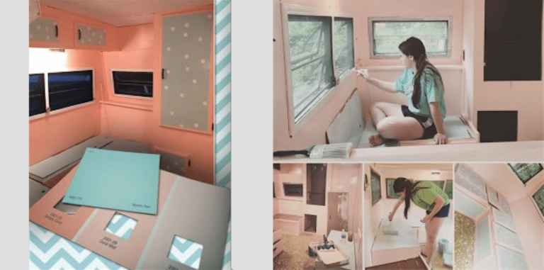 In the picture above, Ellie is cleaning up the excess glue left on the floor after everything was taken apart. She then went and painted the camper using Valspar’s “Mystic Sea” paint.