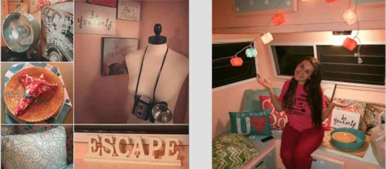 Ellie is still decorating the nearly finished Glamper with her decorations, which also include a vintage camera, a vintage electric fan, and complimentary napkins. made by her grandmother.