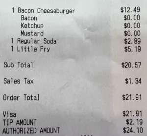 As of late, a benefactor took to web-based entertainment to share a receipt adding up to $24.10 for an independent feast, including a bacon cheeseburger evaluated at $12.49, a normal soft drink for $2.89, and a serving of fries for $5.19.