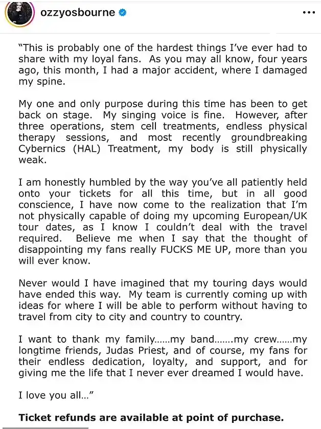 Ozzy gave his audience a moving statement expressing his sadness at the prospect of letting them down.