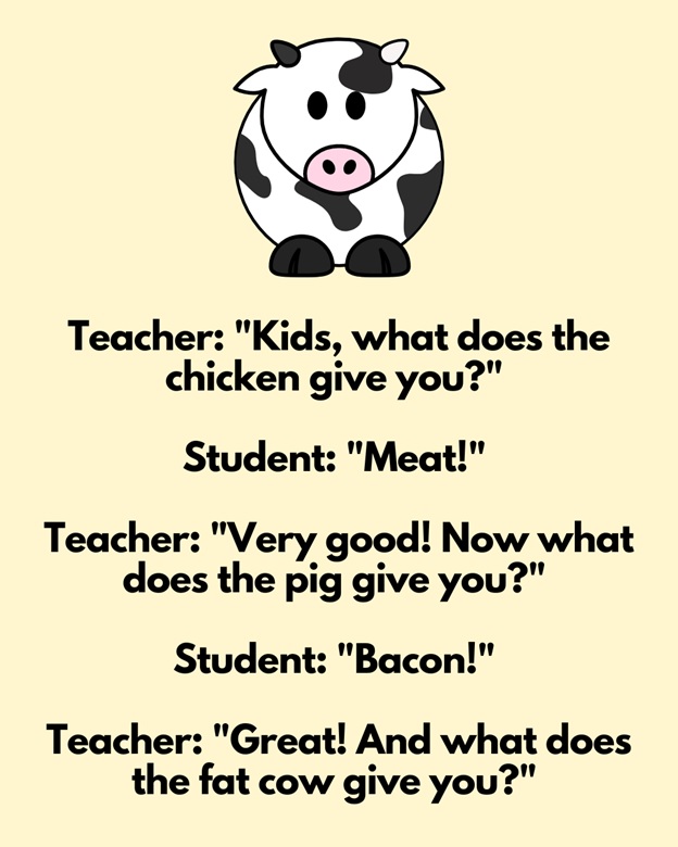 Educator: “Children, what does the chicken give you?” Understudy: “Meat!” Instructor: “Awesome! Presently what does the pig give you?”
