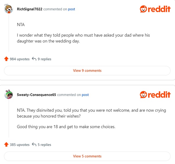 “NTA. What sort of man doesn’t have his own youngster at his wedding? At any rate, they went with the decision, assuming they accept it was the ideal decision they ought to have no issue about it being openly known. Furthermore, individuals could well expect you weren’t there since you objected to his new spouse or picked an excursion all things considered. Guaranteeing individuals know WHY you weren’t there saves your own standing,” one individual remarked.