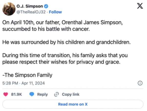 The Simpson family as of late made an announcement reporting O.J. Simpson’s passing at 76 years old.
